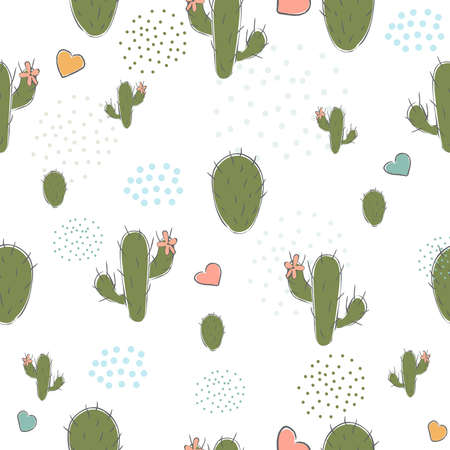 緑のサボテン 白い紙の背景にグループ化されたドットとハートとかわいいシームレスなパターン ベクトルイラストレーション の写真素材 画像素材 Image